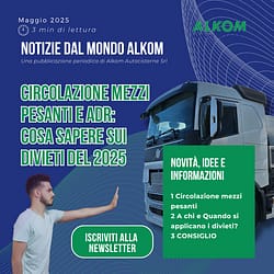 Newsletter Alkom – Maggio 2025 Circolazione mezzi pesanti e ADR: cosa sapere sui divieti del 2025 Come ogni anno, il Ministero delle Infrastrutture e dei Trasporti ha pubblicato il Calendario 2025 dei divieti di circolazione per i mezzi pesanti con massa complessiva superiore a 7,5 tonnellate. Una normativa importante, che impatta direttamente il lavoro di[…]