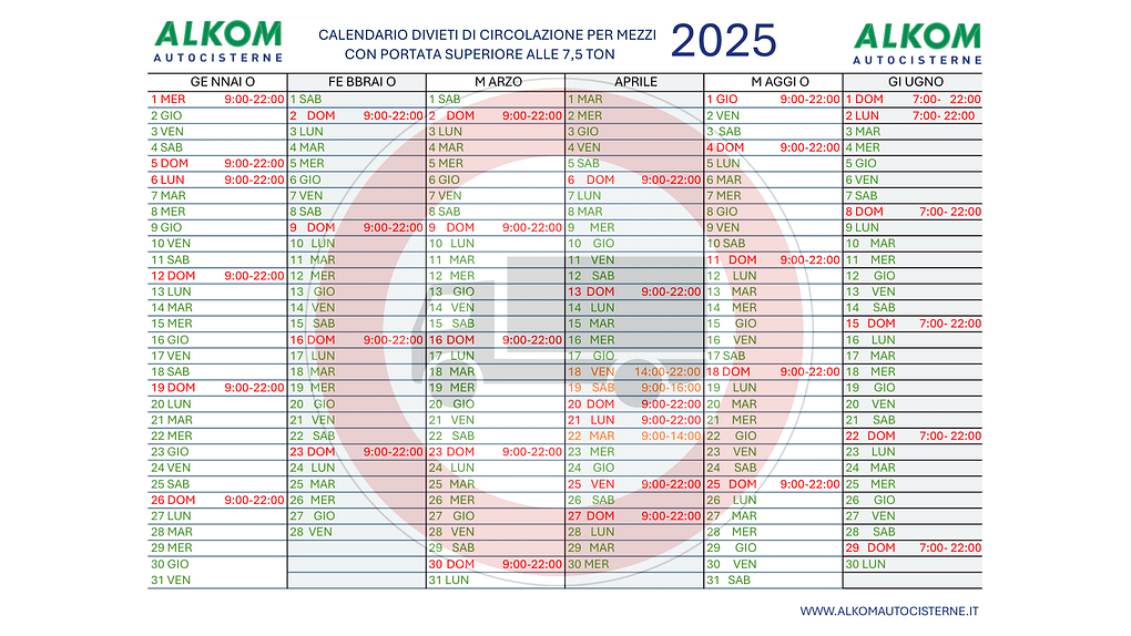 Le giornate e gli orari dei divieti sono dettagliati mese per mese nel calendario ufficiale (che puoi visualizzare e scaricare anche dal nostro sito o in formato PDF). In generale, i divieti si applicano nei fine settimana, nei giorni festivi e in date particolari con elevato traffico previsto. Le fasce orarie variano, ma spesso includono le 9.00 – 22.00, con alcune eccezioni.