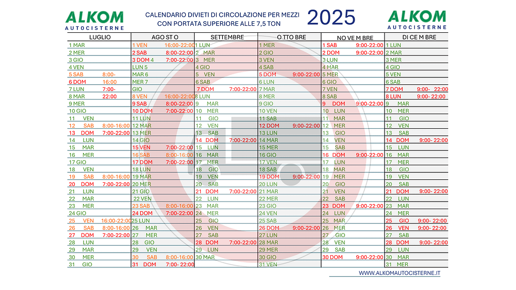 Come ogni anno, il Ministero delle Infrastrutture e dei Trasporti ha pubblicato il Calendario 2025 dei divieti di circolazione per i mezzi pesanti con massa complessiva superiore a 7,5 tonnellate. Una normativa importante, che impatta direttamente il lavoro di chi, come noi e i nostri clienti, opera nel mondo della logistica, dei carburanti e delle merci pericolose.