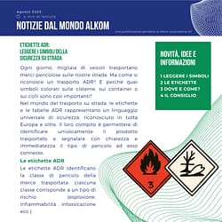 Newsletter Alkom – Agosto 2025 Etichette ADR: leggere i simboli della sicurezza su strada Ogni giorno, migliaia di veicoli trasportano merci pericolose sulle nostre strade. Ma come si riconosce un trasporto ADR? E perché quei simboli colorati sulle cisterne, sui container o sui colli sono così importanti? Nel mondo del trasporto su strada, le etichette[…]